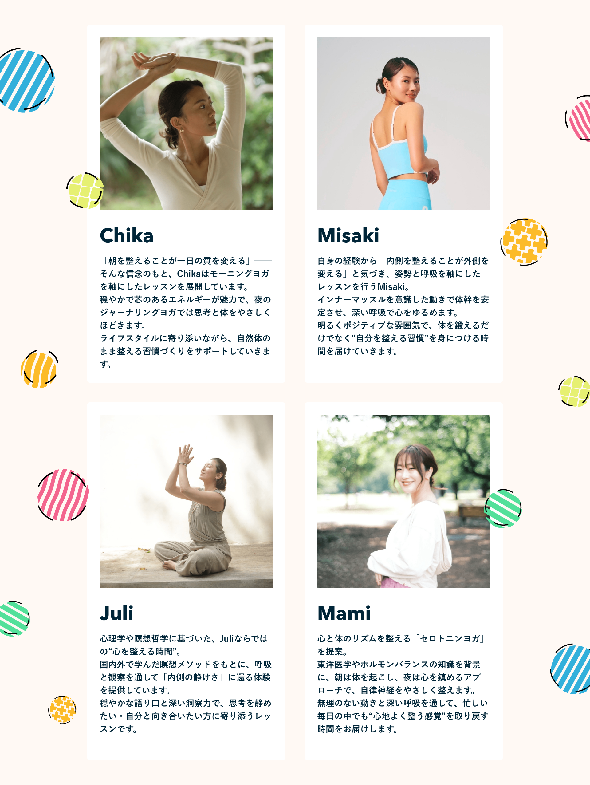 ヨガレッスンでは、人気インストラクターが朝・昼・夜のレッスンを担当し、ときにはライブ配信も行います。