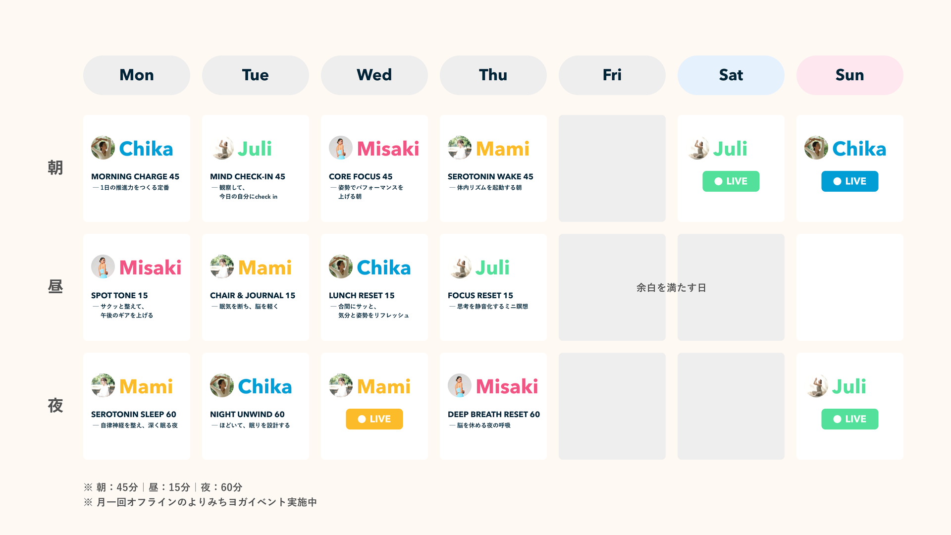 一週間を通じて、朝はスイッチを入れる、昼はリセット、夜はリラックス…という目的を軸にしながら、“働く人の一週間に寄り添うオリジナルプログラム”として設計しています。